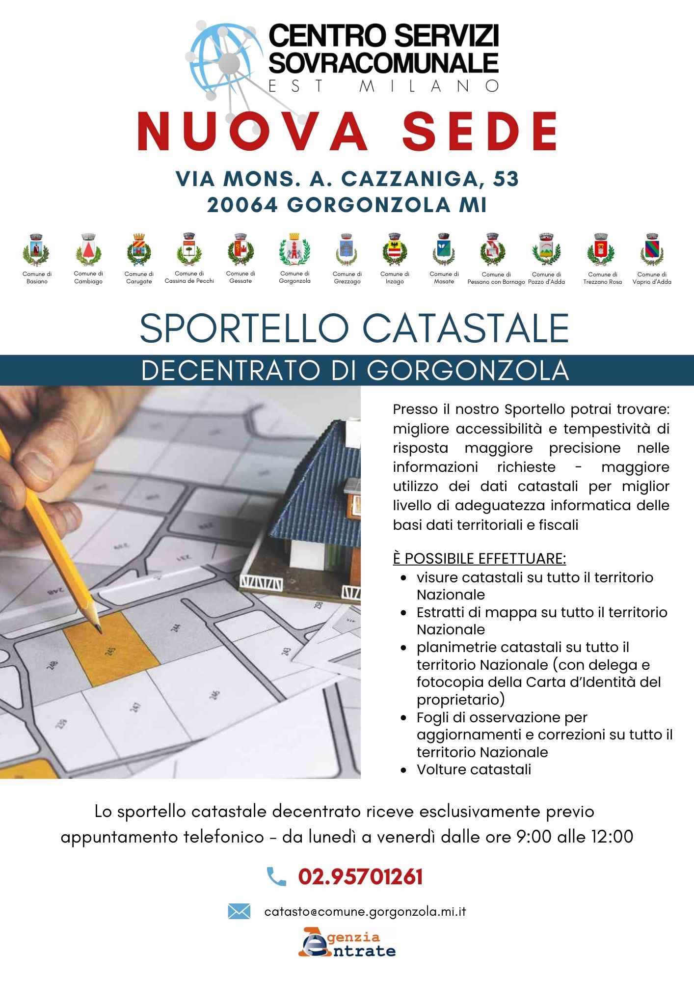 Lo Sportello Catastale Decentrato di Gorgonzola, riceve esclusivamente previo appuntamento telefonico allo 0295701261 dal lunedì al venerdì dalle 8.30 alle 12.00 in Via Mons. A. Cazzaniga 53.